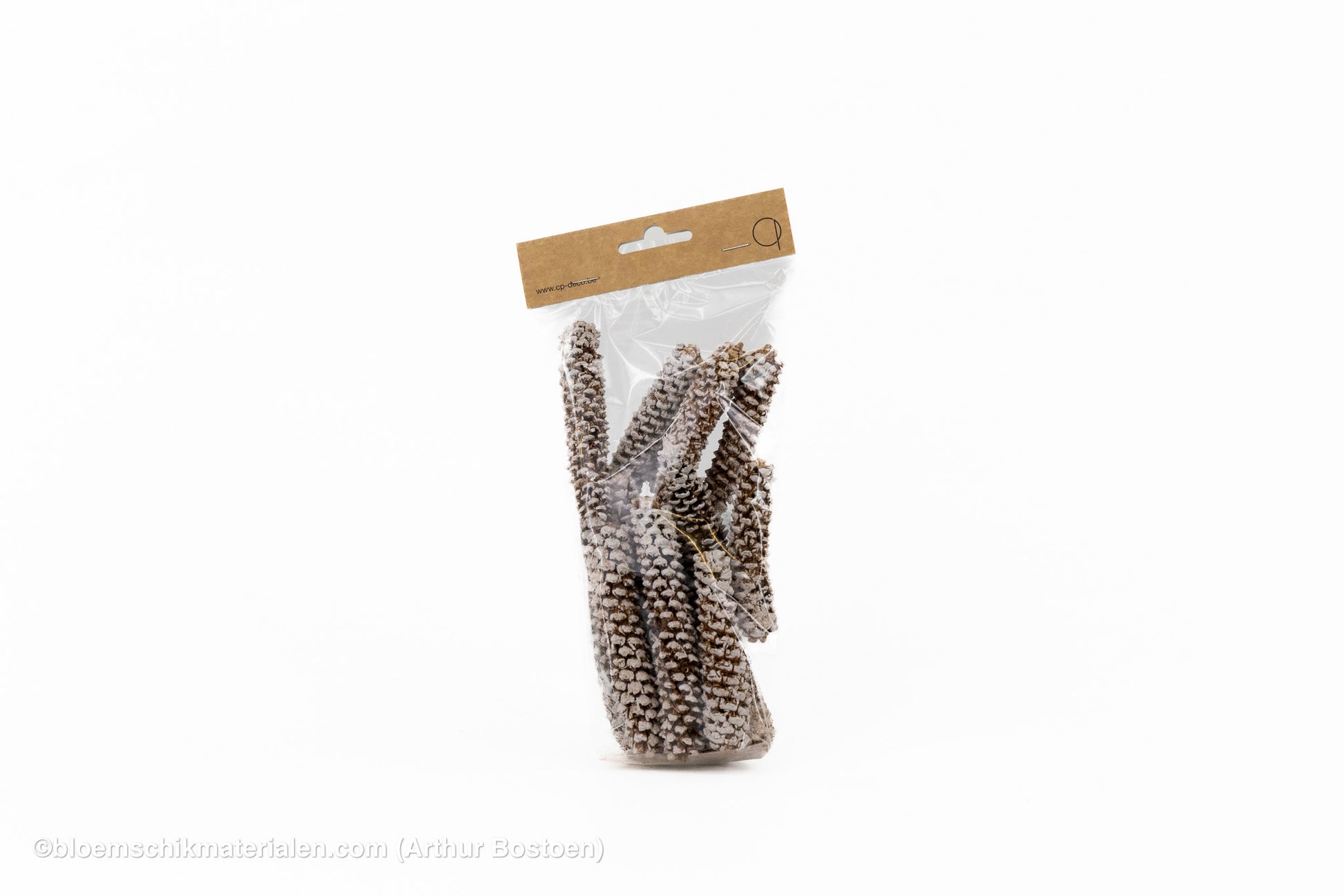 Deze geraspelde fijnsparappels zijn voorzien van een white wash laag, wat zorgt voor een frisse en winterse uitstraling. Hun open textuur maakt ze ideaal om diepte en variatie te brengen in bloemstukken, kerstarrangementen of tafeldecoraties.