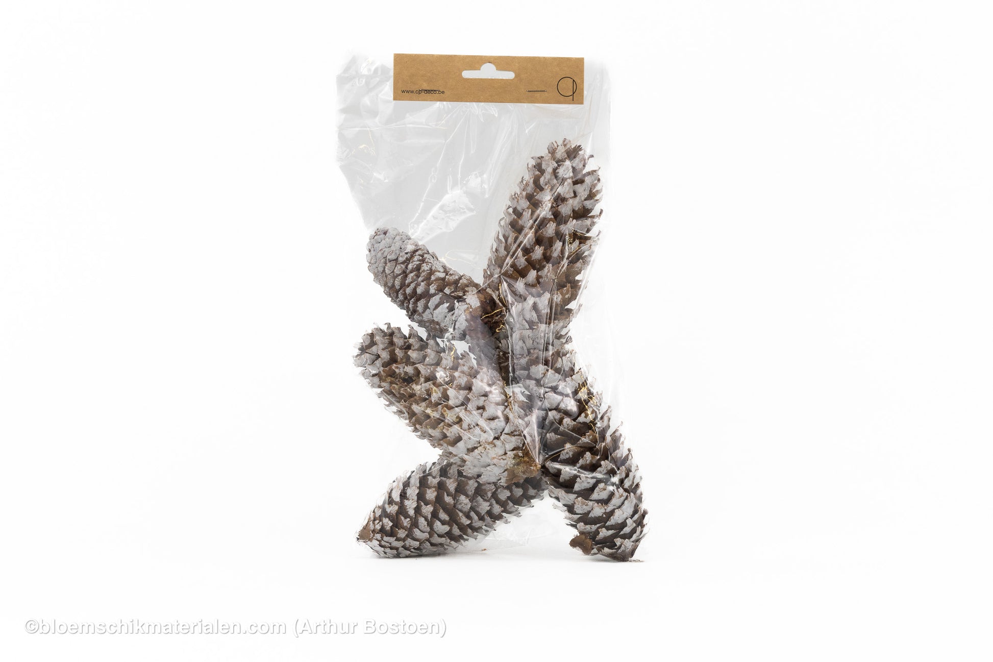 Deze lange grote fijnsparappels zijn afgewerkt met een subtiele white wash laag, wat ze een frisse en winterse uitstraling geeft. Ideaal voor kerststukken, adventskransen of winterse tafeldecoraties.