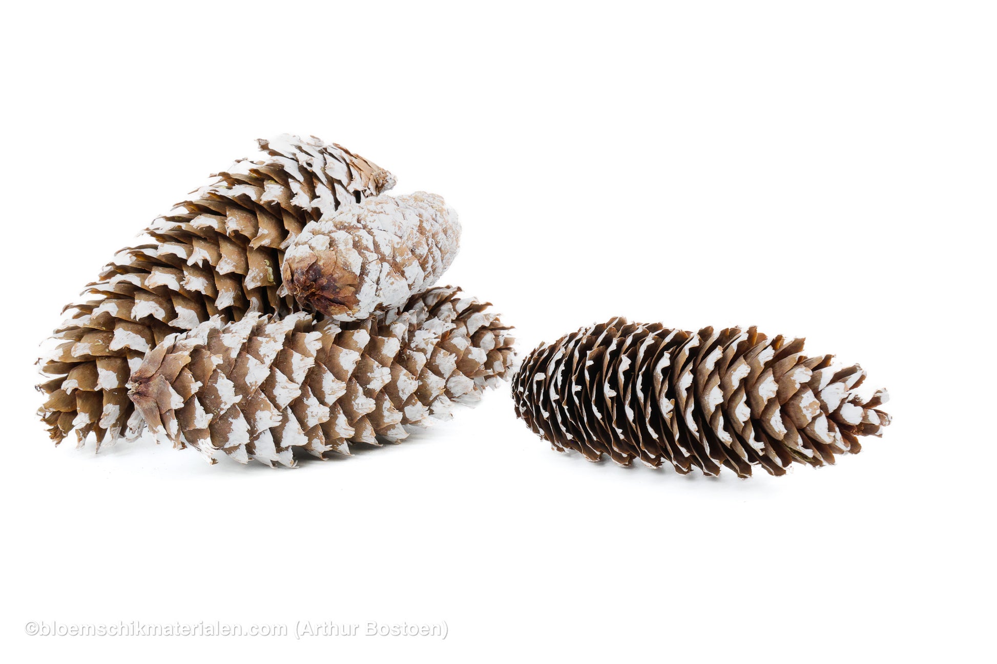 Deze lange grote fijnsparappels zijn afgewerkt met een subtiele white wash laag, wat ze een frisse en winterse uitstraling geeft. Ideaal voor kerststukken, adventskransen of winterse tafeldecoraties.