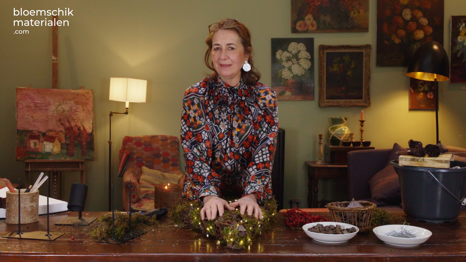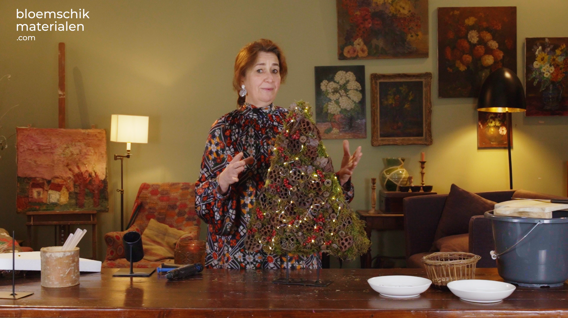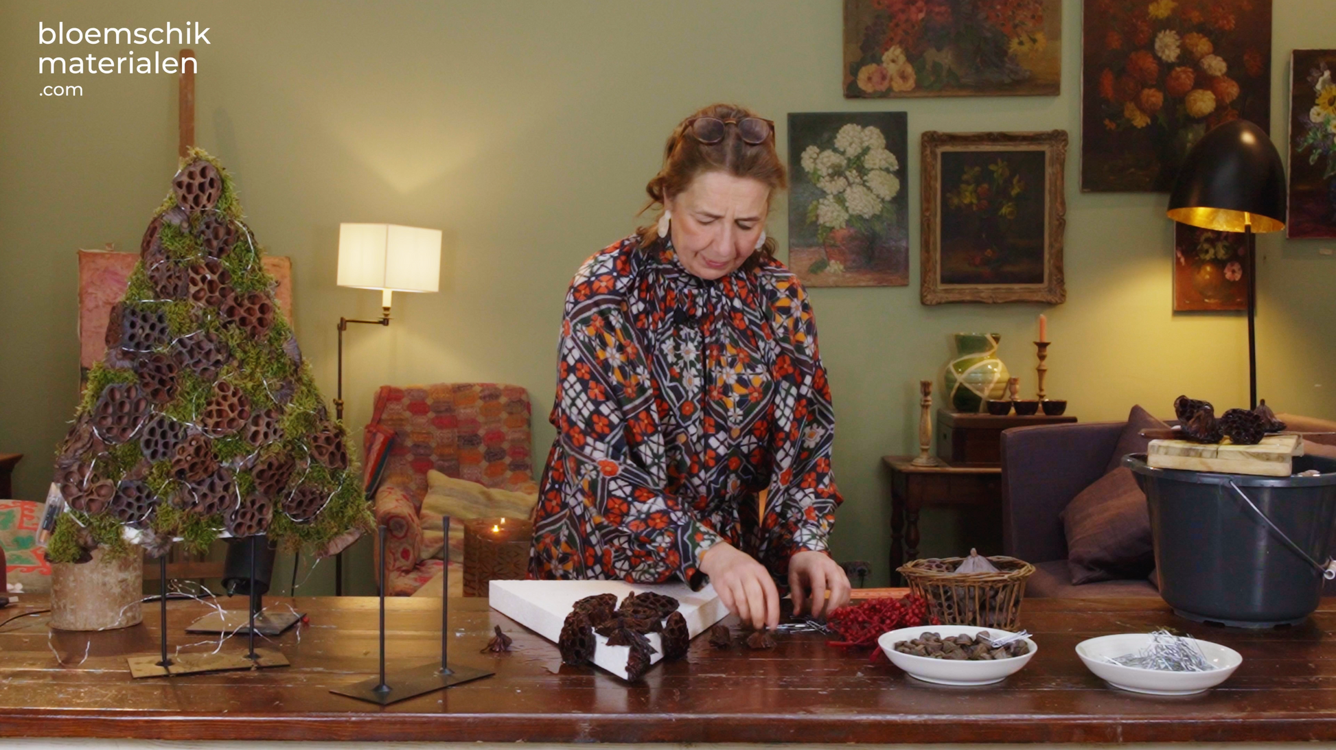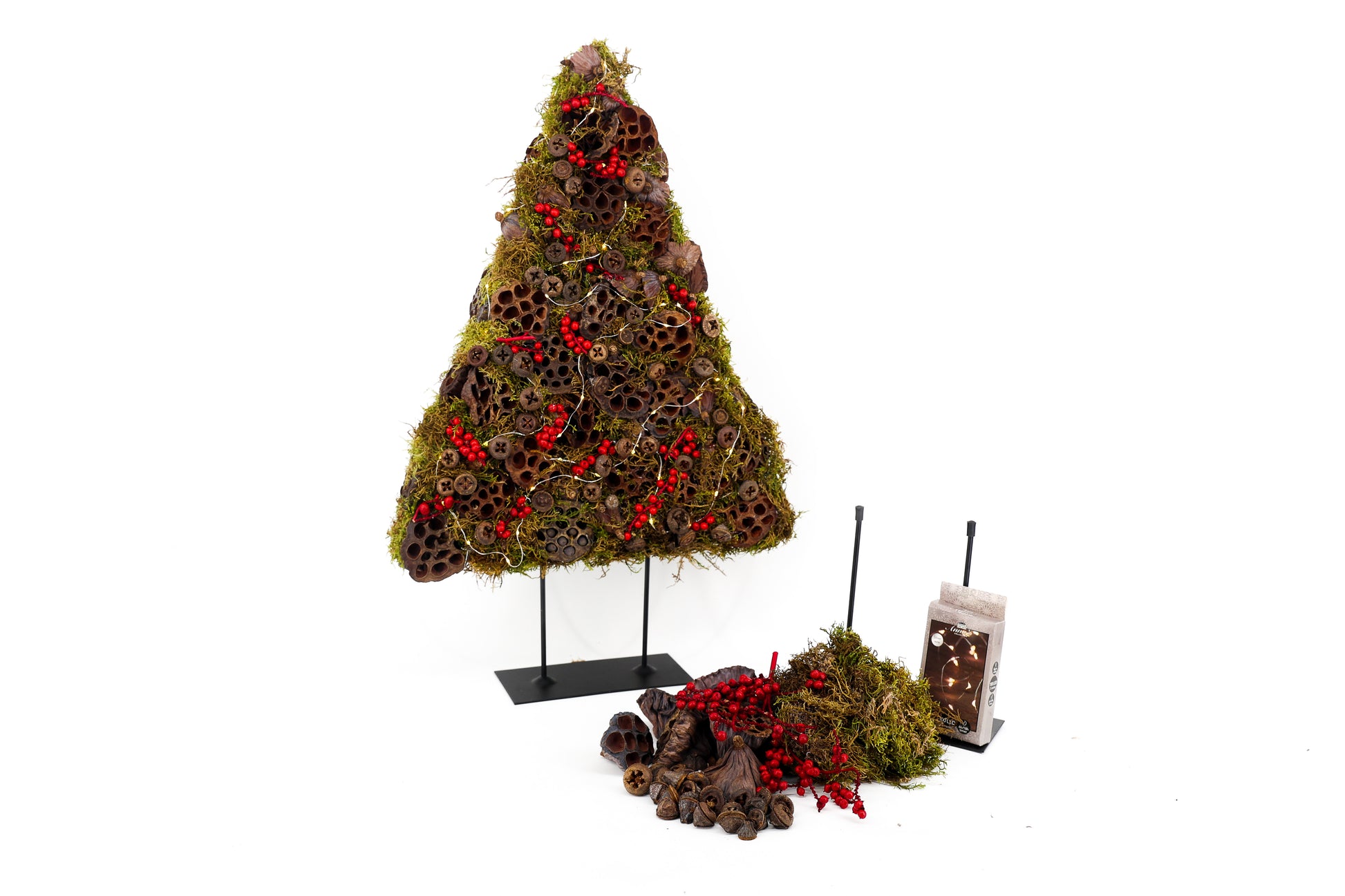 Leer bloemschikken via onze gemakkelijke bloemschikpakketten. Hiermee maak je een kerstboom met eucalyptus & canella: een stijlvolle boom op voetje — perfect als alternatief voor de klassieke kerstboom of als extra sfeermaker in een andere kamer. Je vormt de boom met mos en werkt rijk af met eucalyptusvruchten (pods) en Canella (kaneel). Een snoer LED-lichtjes (±100 st.) zorgt voor warme, feestelijke gloed. Het resultaat is een tijdloze blikvanger die het hele seizoen straalt. Ambachtelijk, puur en gemaakt uit natuurlijke materialen die mooi blijven.