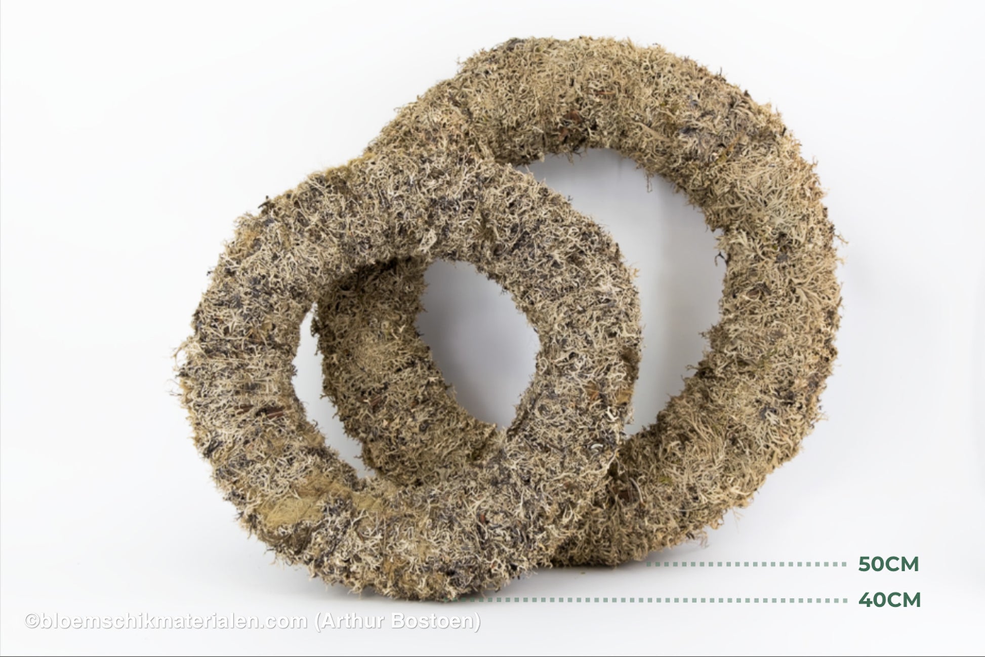 De krans van grijs mos met een diameter van 40 cm is een prachtige keuze voor rouwstukken, kerstdecoraties of rustieke bloemarrangementen. Het grijze mos heeft een subtiele, doch verfijnde uitstraling die perfect past bij winterse of sombere thema’s. Deze krans is ideaal voor het maken van decoraties die een gevoel van sereniteit en rust uitstralen. Korstmossen, zoals rendiermos, vormen een belangrijk onderdeel van de vegetatie in koude gebieden zoals de toendra’s en het Antarctisch gebied, wat deze krans een authentieke en natuurlijke uitstraling geeft.