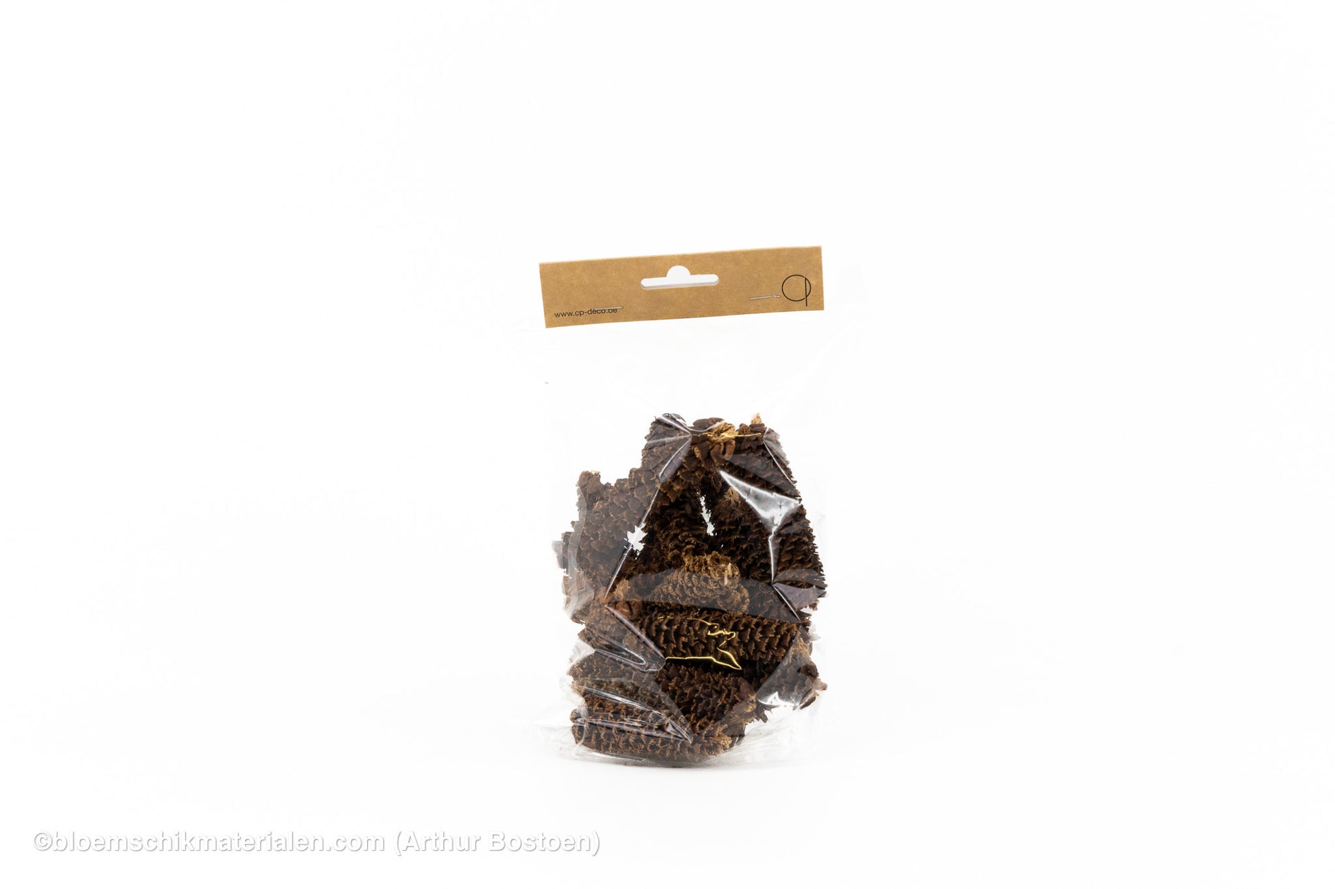 Deze geraspelde dennenappels van de Picea omorika (Servische spar) hebben een warme bruine kleur en een levendige structuur. Hun natuurlijke uitstraling maakt ze perfect voor herfst- en winterarrangementen, adventskransen of rustieke tafeldecoraties.