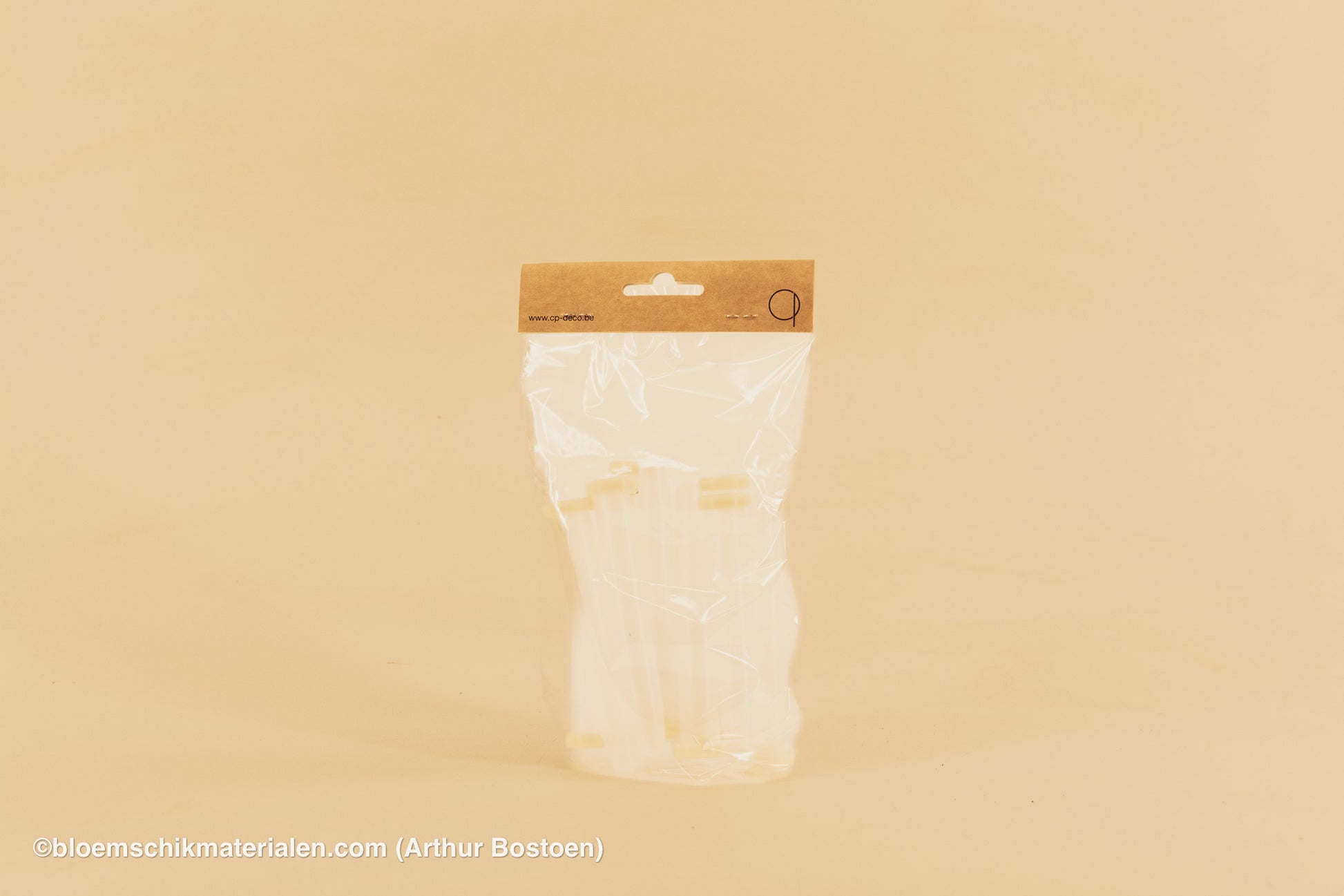 De Plastic Buisjes 16CC 11x1,7cm zijn grotere buisjes die geschikt zijn voor langere bloemstelen of takjes en natuurlijke materialen. Het herbruikbare plastic biedt stevigheid en het rubberen dopje met gaatje houdt de bloemen stevig recht, terwijl het ervoor zorgt dat er geen water ontsnapt. Deze buisjes kunnen voor een breder scala van toepassingen worden gebruikt en zijn perfect voor bloemisten die grotere stukken willen maken.